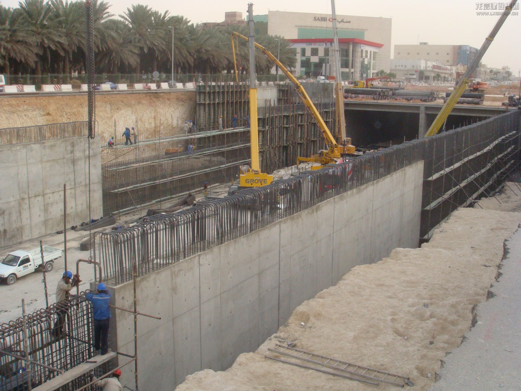 項目位于沙特首都利雅得市阿仆杜拉國王大道上,全長5KM,分為阿卜杜拉•阿齊茲地下通道、歐萊雅路-法赫德國王路隧道、塔卡蘇斯地下通道及普瑞恩施•土耳其路地下通道??偘綖樯程貖W吉公司,龍信公司分包該項目的全部混凝土結構工程,澆筑混凝土達到16萬立方,分包合同總金額為3200.00萬里亞爾。于2008年9月開工,并在2011年02月完工,工期比總包方規定的時間提前了半年,并且質量上面受到了總包的一片好評。