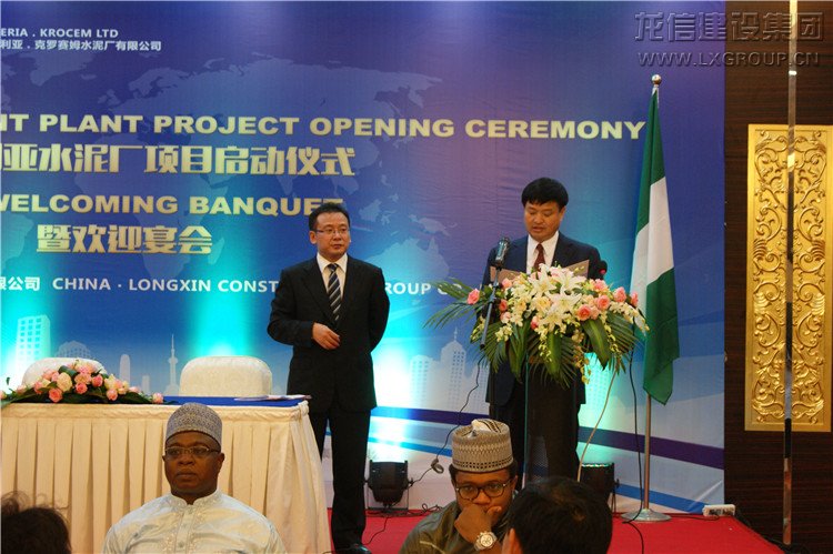2015年6月15日晚上八點,尼日利亞KROCEM水泥廠項目啟動儀式暨歡迎宴會在光華國際大酒店舉行。海門市常務副市長成偉、南通市商務局黨組成員、中國國際貿易促進委員會南通分會副會長楊平、南通市商務局外經處處長宋輝、尼日利亞KROCEM有限公司代表團、龍信集團董事長陳祖新、總經理唐愛東、海外公司總經理徐巍松及龍信集團各部門主要領導、江蘇海建股份有限公司領導、中國銀團(中信保、國開行、工商銀行、江蘇銀行)代表等出席了啟動儀式及歡迎宴會。
