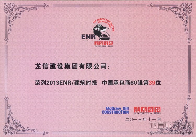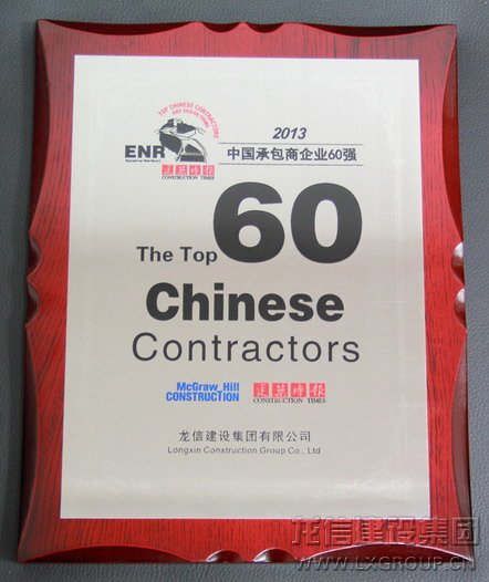 11月22日,由《建筑時報》和美國《工程新聞記錄》(ENR)合作舉辦的2013ENR/建筑時報“中國承包商和工程設計企業雙60強”排名揭榜,頒獎典禮在廣西南寧舉行。龍信集團以超強的綜合實力連續第5年躋身“中國承包商60強”,在入圍的精英企業中排第39名,同時位列“2013年最具效益承包商”第9名。